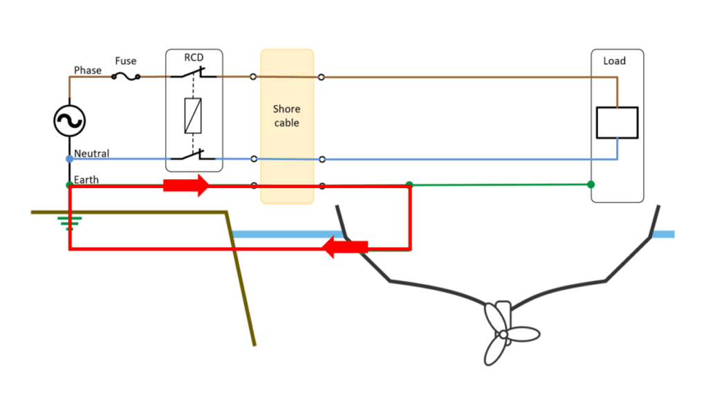 Situasjonen er spesielt ugunstig hvis landstrømsystemet er av type TN, slik som på tegningen over. Også ved en forholdvis normal driftssituasjon, uten feil, så vil jordlederen fra land kunne få en likespenningkomponent som bidrar til galvanisk korrosjon. Ved teknisk feil og en “stående jordfeil” så vil man kunne få den samme problemstillingen i et IT-fordelingssystem.